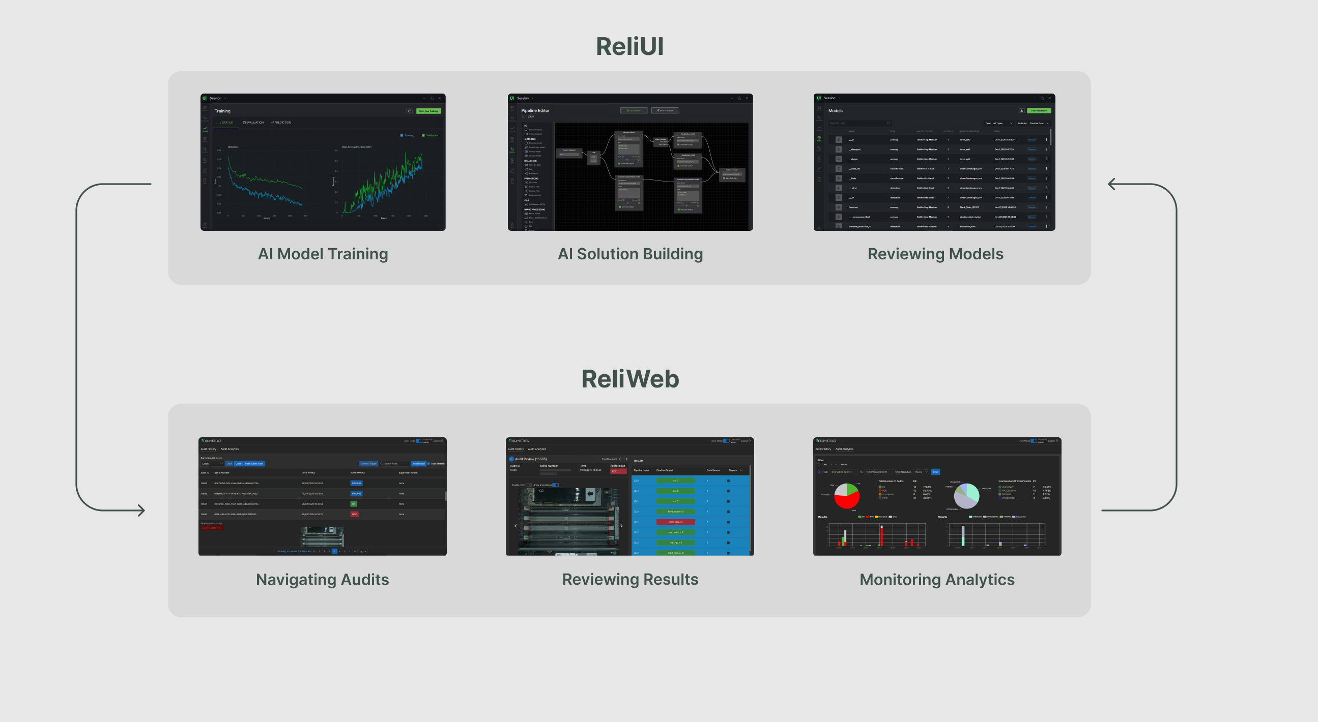 1. ReliUI is the unified application for the entire AI inspection lifecycle, providing data annotation, training workflows for ReliTrainer, pipeline editing for inspection logic, deployment interfaces for ReliAudit, and the former ReliBoard capabilities such as web-based asset management, AI model evaluation, user management and system log monitoring.