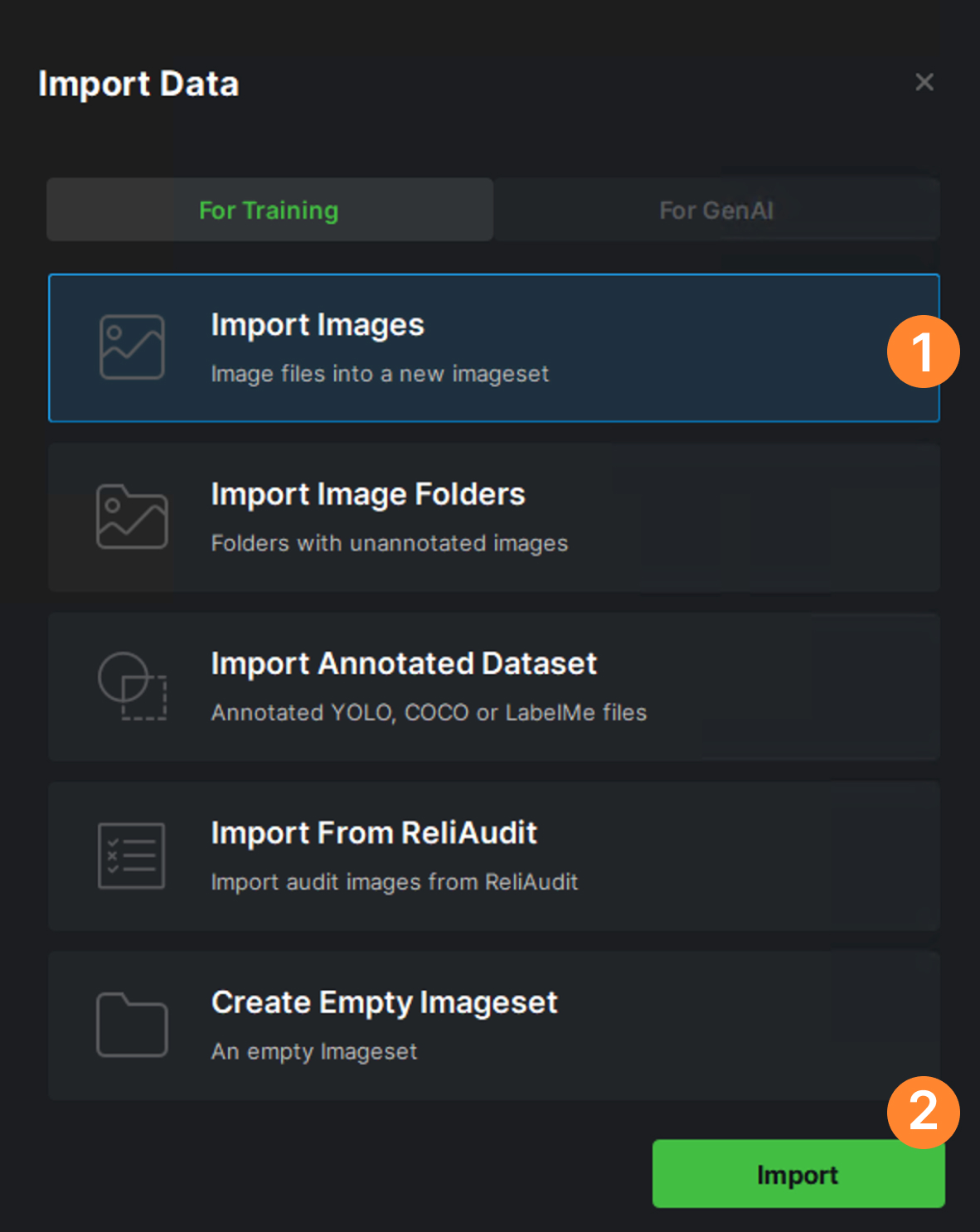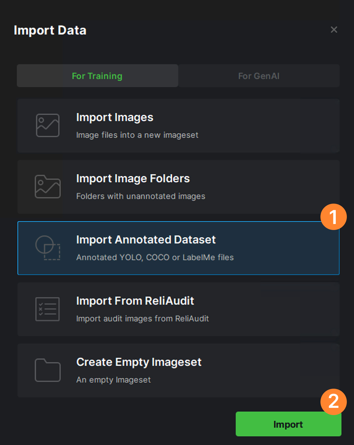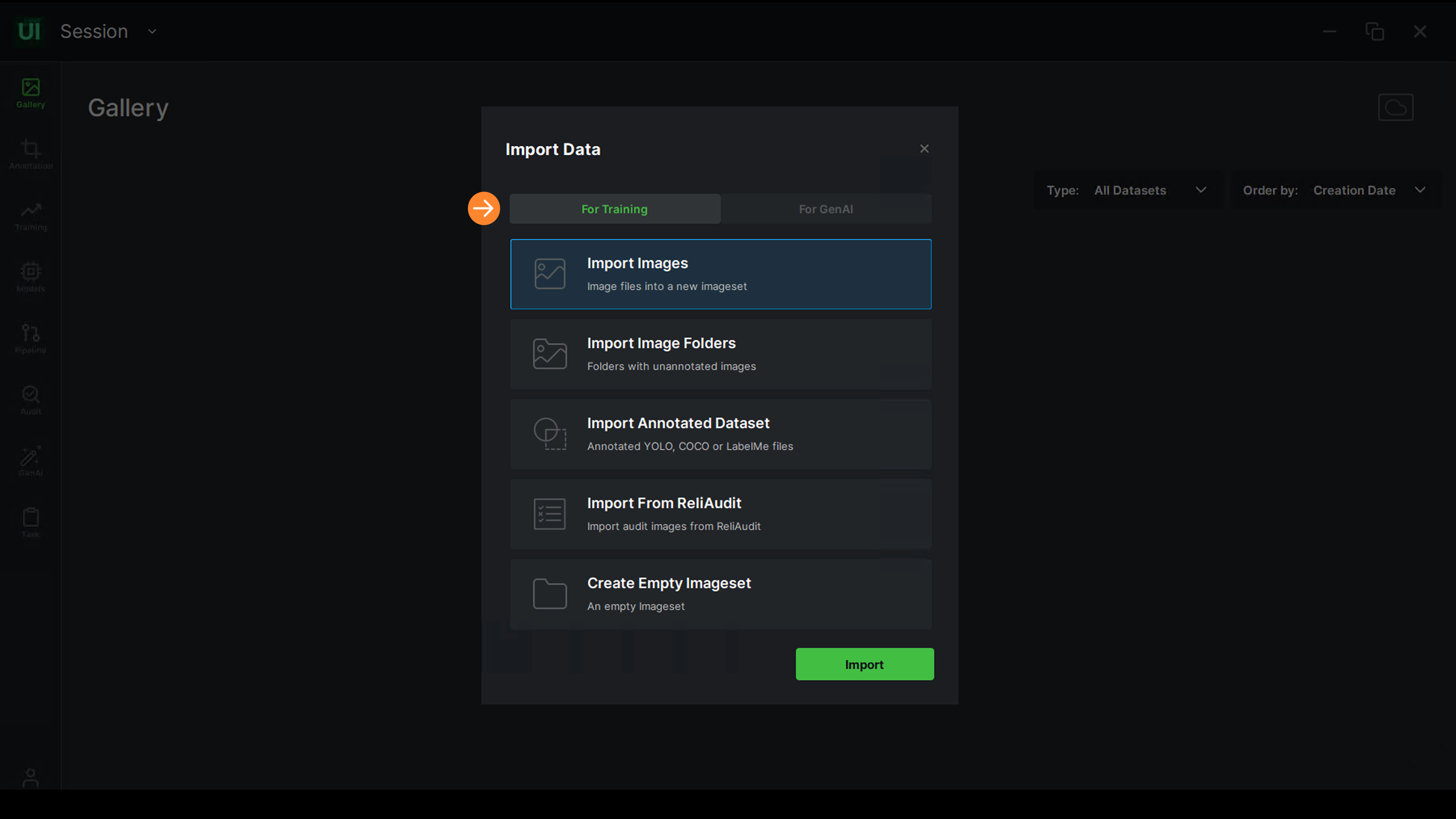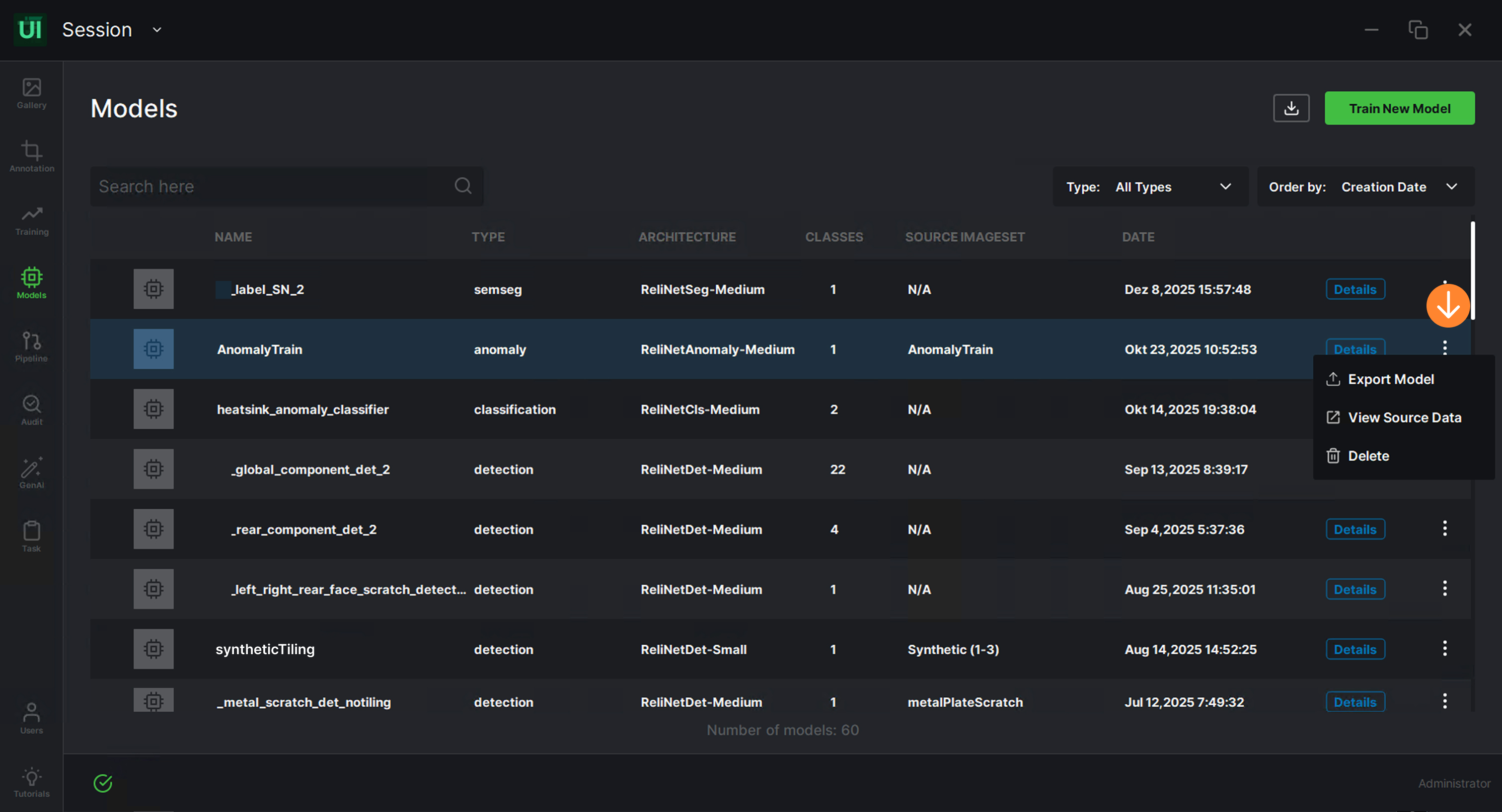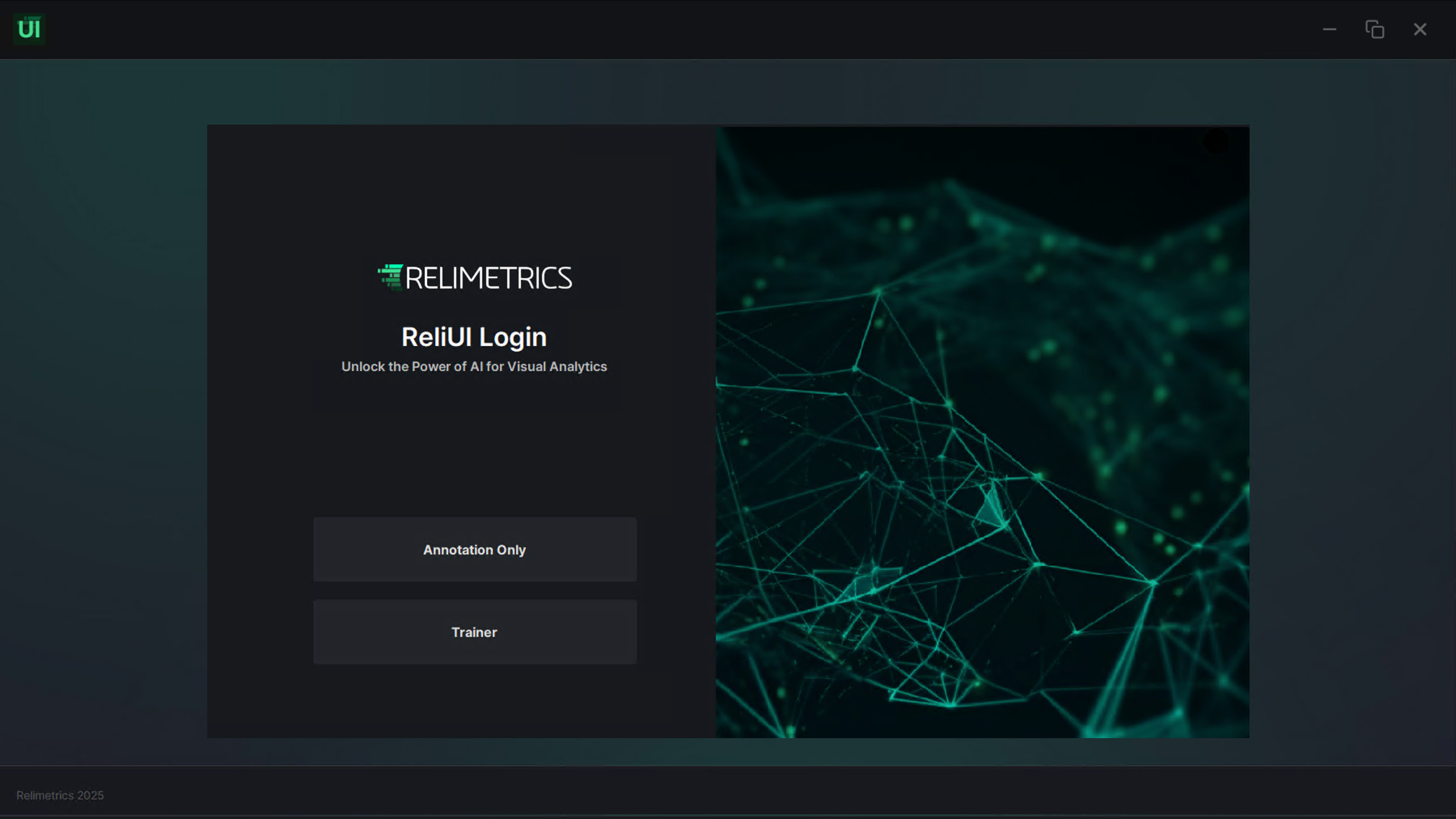 1. ReliUI is the unified front-end application through which users access all ReliTrainer capabilities, including data curation, AI-powered solution design, model (re)training, testing, pipeline configuration, and deployment functions. It also incorporates all former ReliBoard features directly into the application such as user management, process monitoring, asset oversight, and dataset/model dashboards.