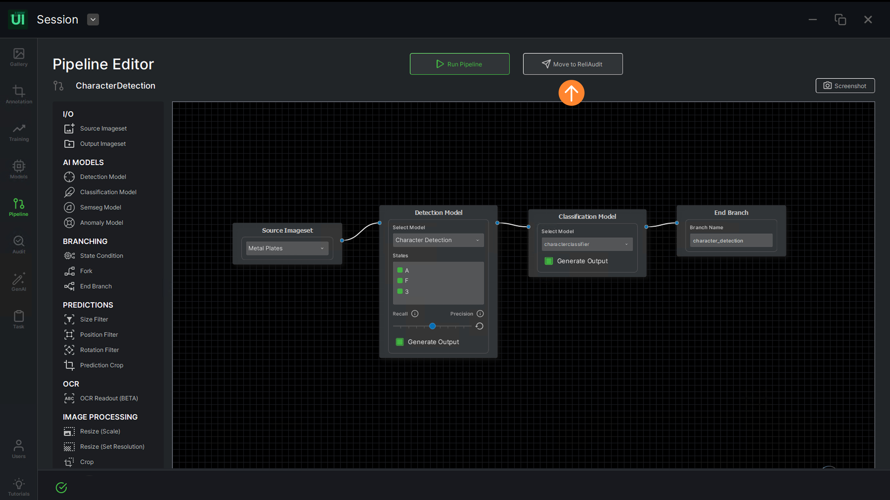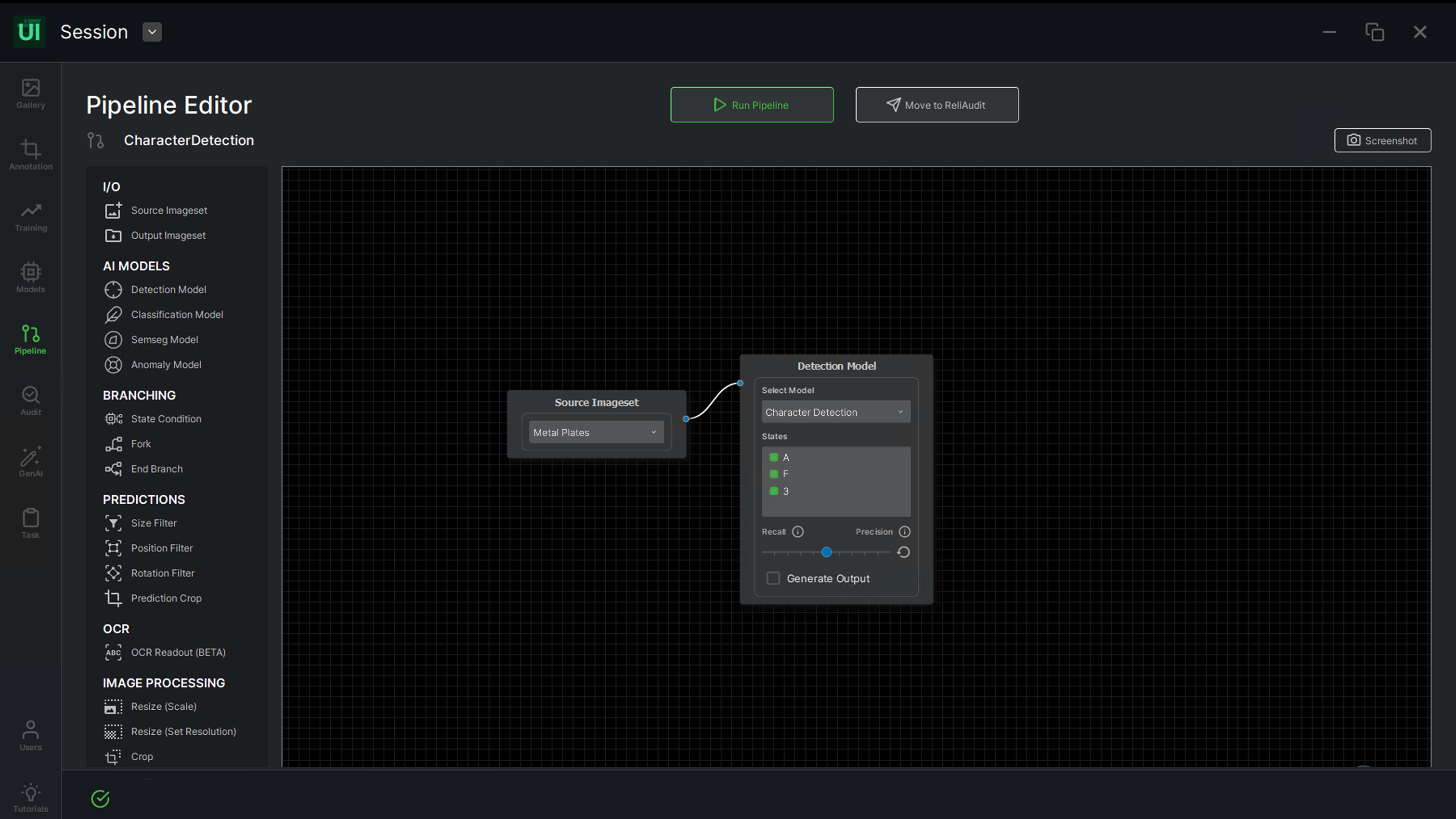 The Relimetrics’ ReliVision platform is an end-to-end custom solution development environment for designing, training, deploying and perfecting AI powered automated inspection pipelines on any (visual) data. The industry and data source agnostic ReliVision platform brings pre-implemented AI models to end-users. The pipeline concept, which is an end-to-end inspection solution, is at the heart of the ReliVision platform. In its most general form, a pipeline is composed of AI Blocks (AI models) and Basic Blocks (eg. digital signal/image processing - DSP/DIP - functions).